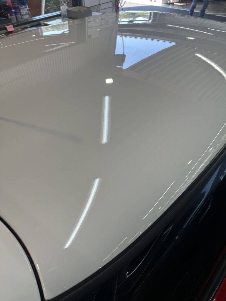 ホワイトパールの塗装は、新車時点でも非常に美しい状態でしたが、軽い磨きを行うことで塗装面をさらに整え、新車以上の艶感を引き出しました。その上にナノメタルコーティングを施工することで、塗装面に強固な被膜を形成。透明感のある深い輝きが生まれ、より高級感のある仕上がりとなっています。