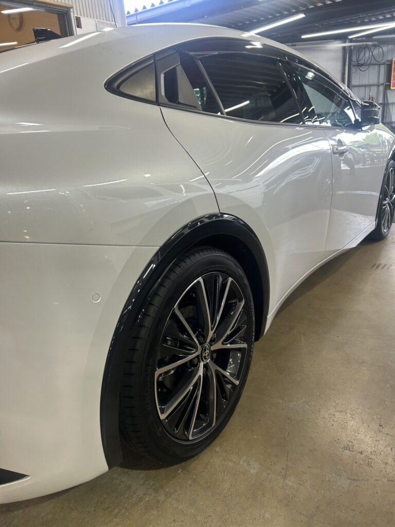 先日、新車で納車されたばかりのプリウス50(ホワイトパール)に、ボディコーティングを施工させていただきました。今回使用したのは、深い艶と高い耐久性を誇る「ボディナノメタル」。さらに、リア5面のウインドウガラスにはフィルム施工も同時に行い、トータルで美観と快適性を高めています。
